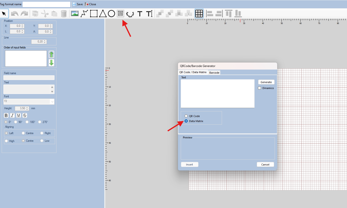 To proceed, simply click on the QR CODE button at the top and then select “Data Matrix”: at this point you can create a definitive code or an editable field that allows you to generate a different DATA MATRIX each time.