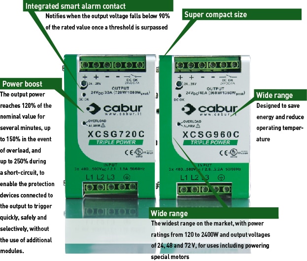 Thanks to these features and the numerous international certifications, this series of power supplies enables designers to meet the requirements of the Machinery Directive EN 60204-1, ensuring fast, safe, and selective tripping of the protections connected on the output side, thereby guaranteeing service continuity to the remaining parts of the system.