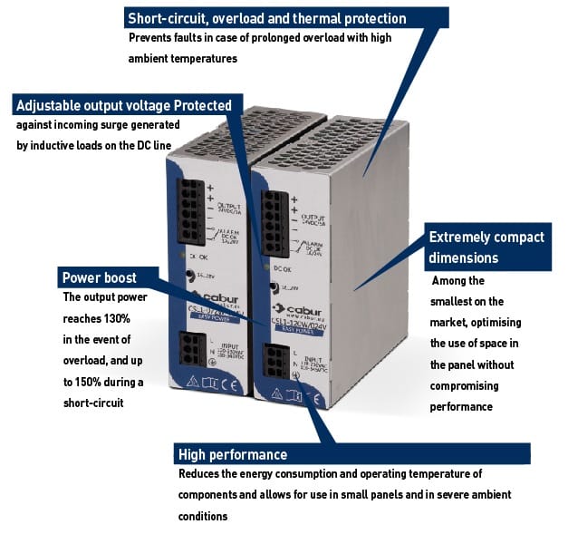 They are capable of delivering over +30% of the nominal current for an extended period, maintaining a stable output voltage and ensuring the system remains powered. Thanks to these features, this series of power supplies allows designers to meet the requirements of the Machinery Directive EN 60204-1, ensuring a fast, safe, and selective intervention of the protections connected to the output. This guarantees service continuity to other parts of the system.