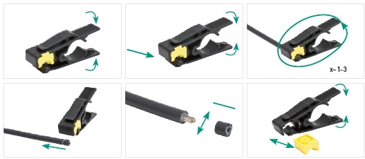 Questa spellacavi è in grado di spelare cavi aventi sezioni di 2.5, 4, 6 e 10 mm 2. Provvista di un riscontro a battuta, consente una lunghezza di spelatura fissa e costante di circa 8 mm conforme a quanto richiesto dai nostri PIN. La lama è intercambiabile.